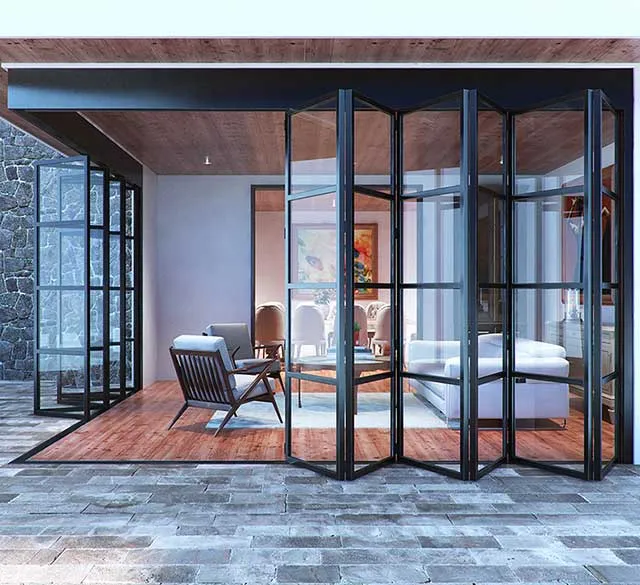 Space-saving aluminum bi-fold doors offering large openings and modern style.