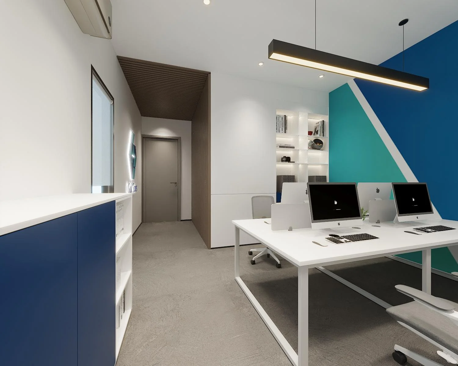 • Architectural Color Blocking: Sharp, diagonal wall motifs in corporate blues and teals to stimulate focus and brand identity.