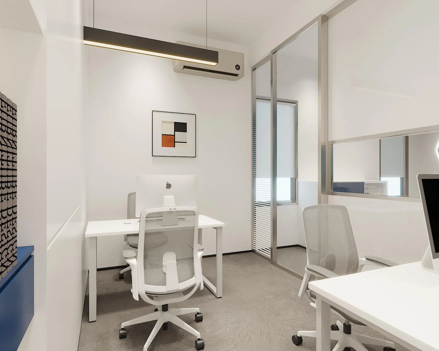 Office Design: This design for the Mozambique Office represents a Modern Vibrant Corporate style (or Tech-Modern Minimalism). Unlike the warm, executive tones of the Maldives project, this space uses high-contrast geometric blocks and a cooler palette to energize the work environment.