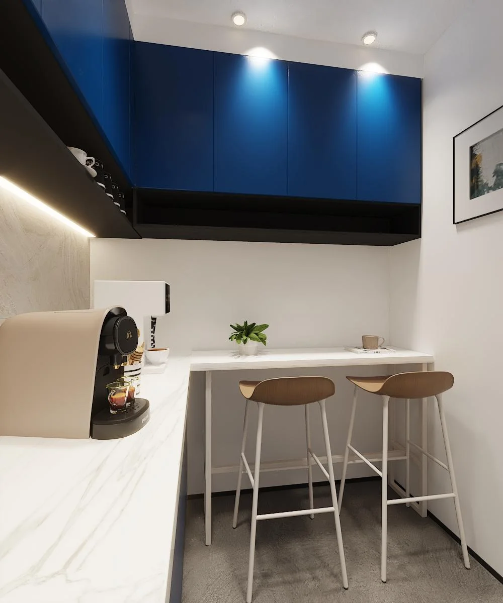 • Smart Storage Integration: Recessed shelving and minimalist blue cabinetry provide ample storage without cluttering the visual field.