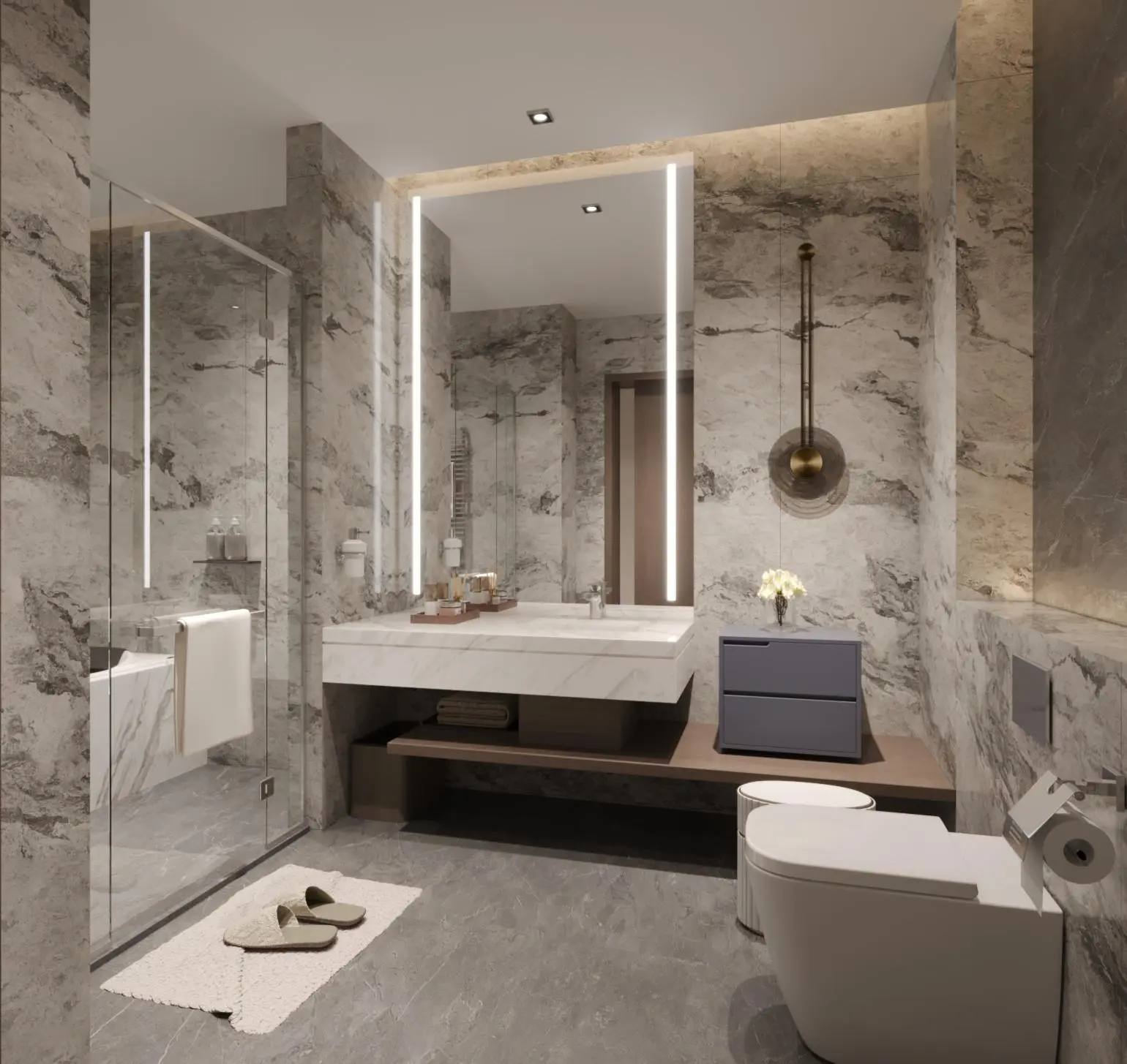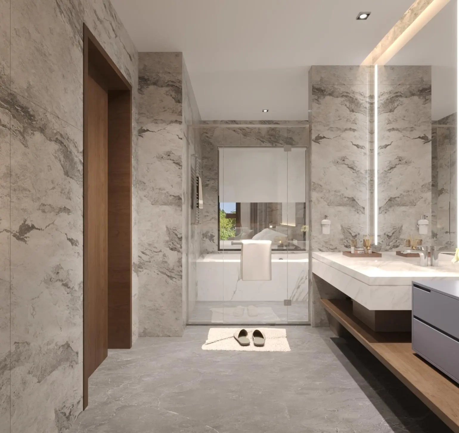 The interior design follows a modern minimalist aesthetic, emphasizing neutral color palettes, soft textures, and streamlined furnishings. Every suite is thoughtfully planned to maximize space efficiency while maintaining a calm and elegant atmosphere. Natural lighting, simple geometric forms, and high-quality finishes work together to create a sense of openness and comfort.