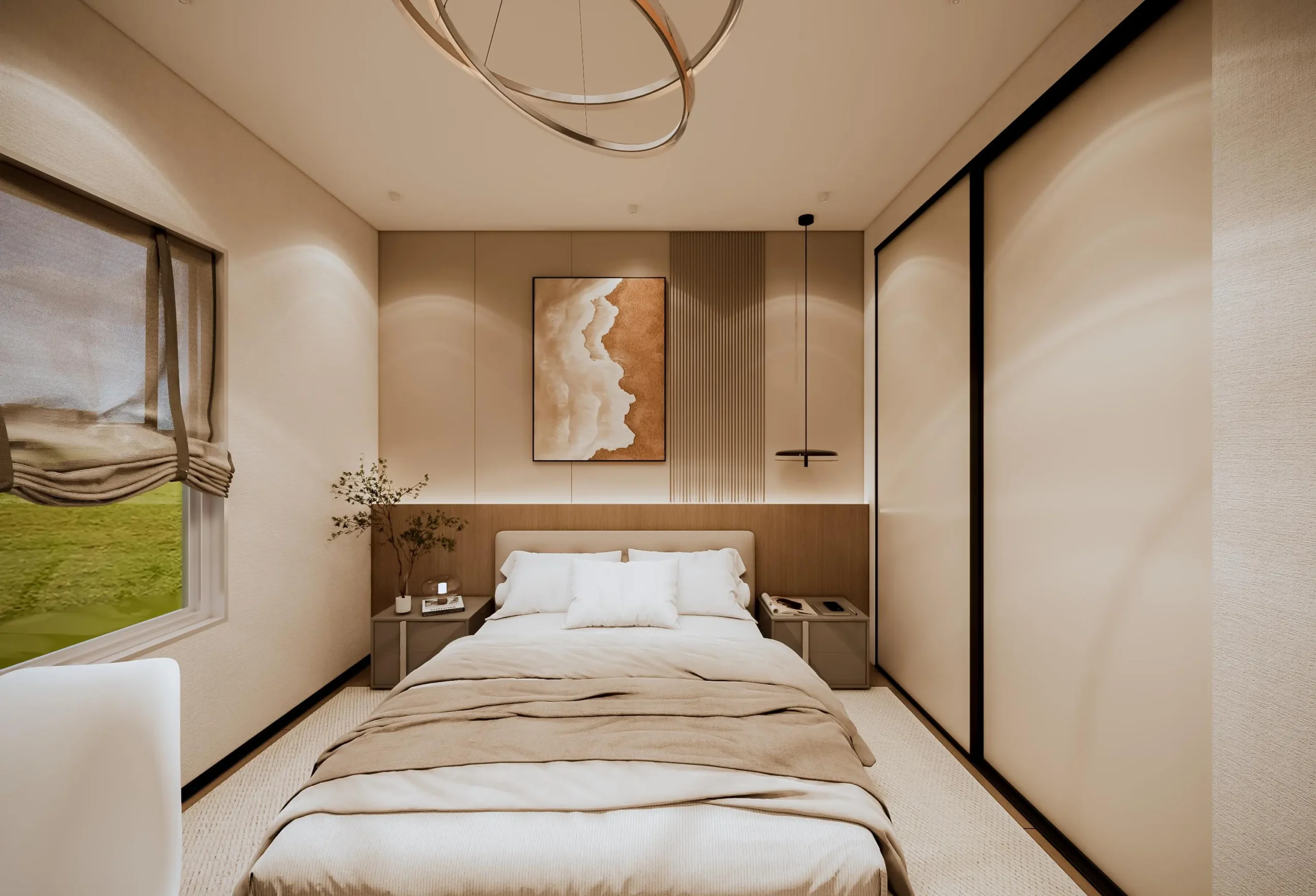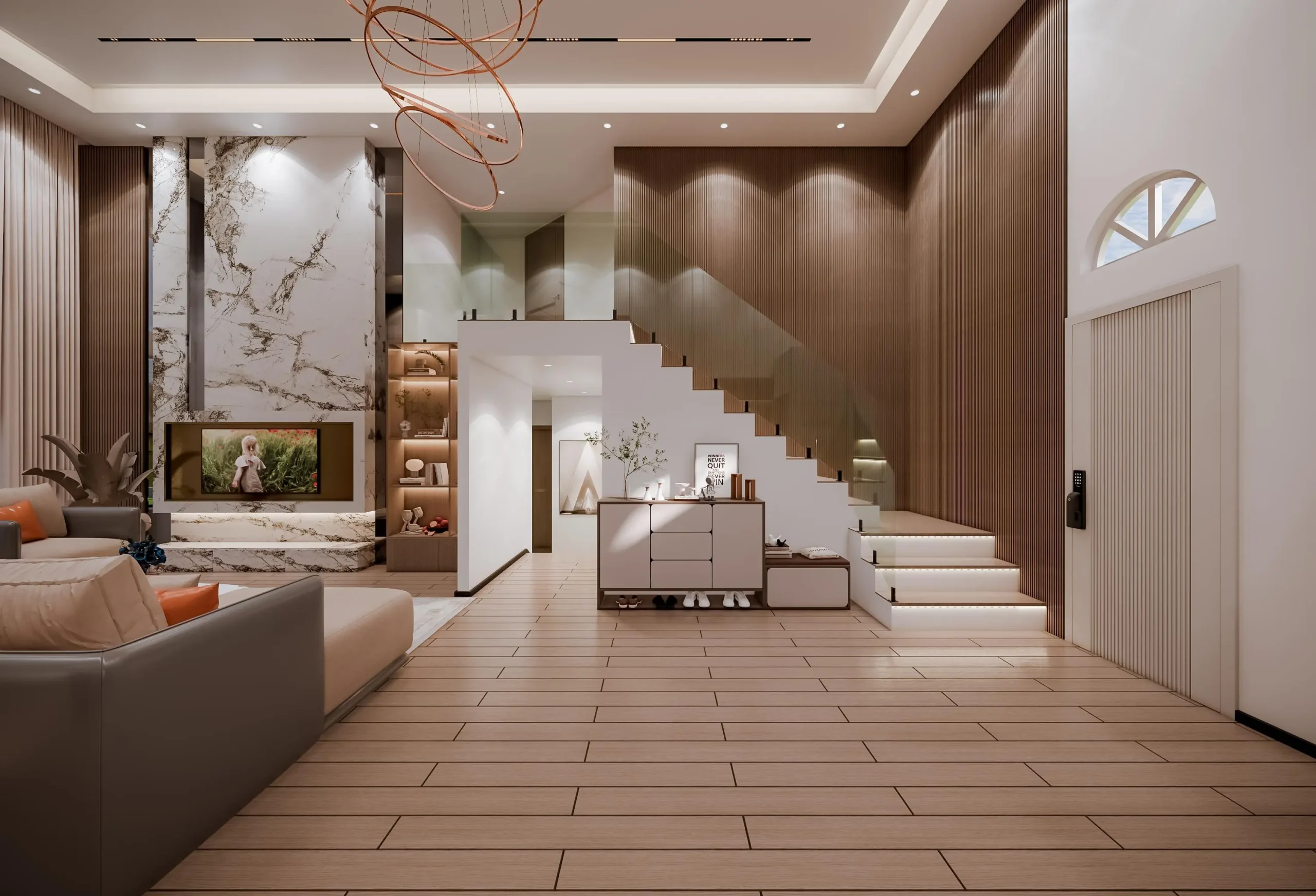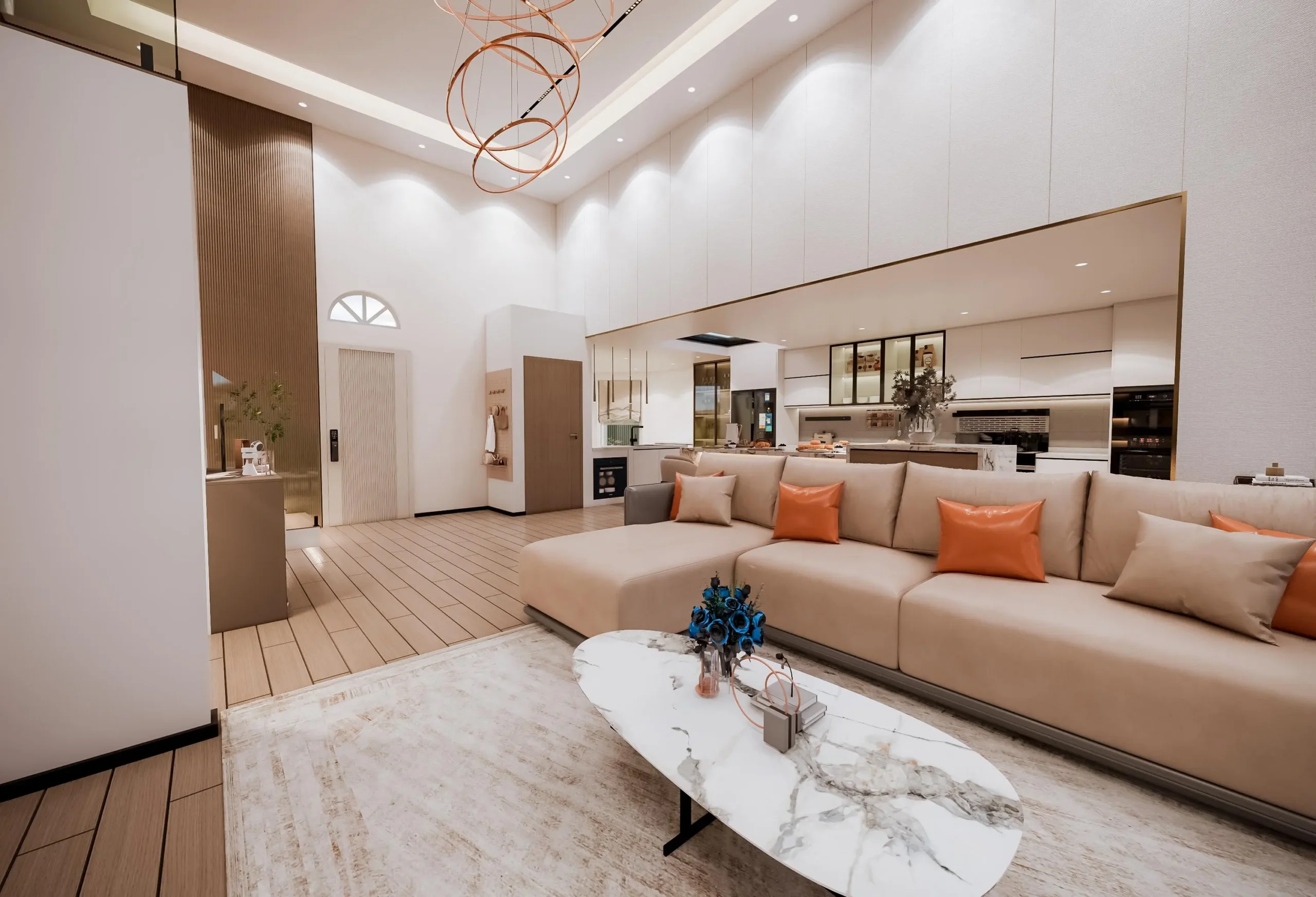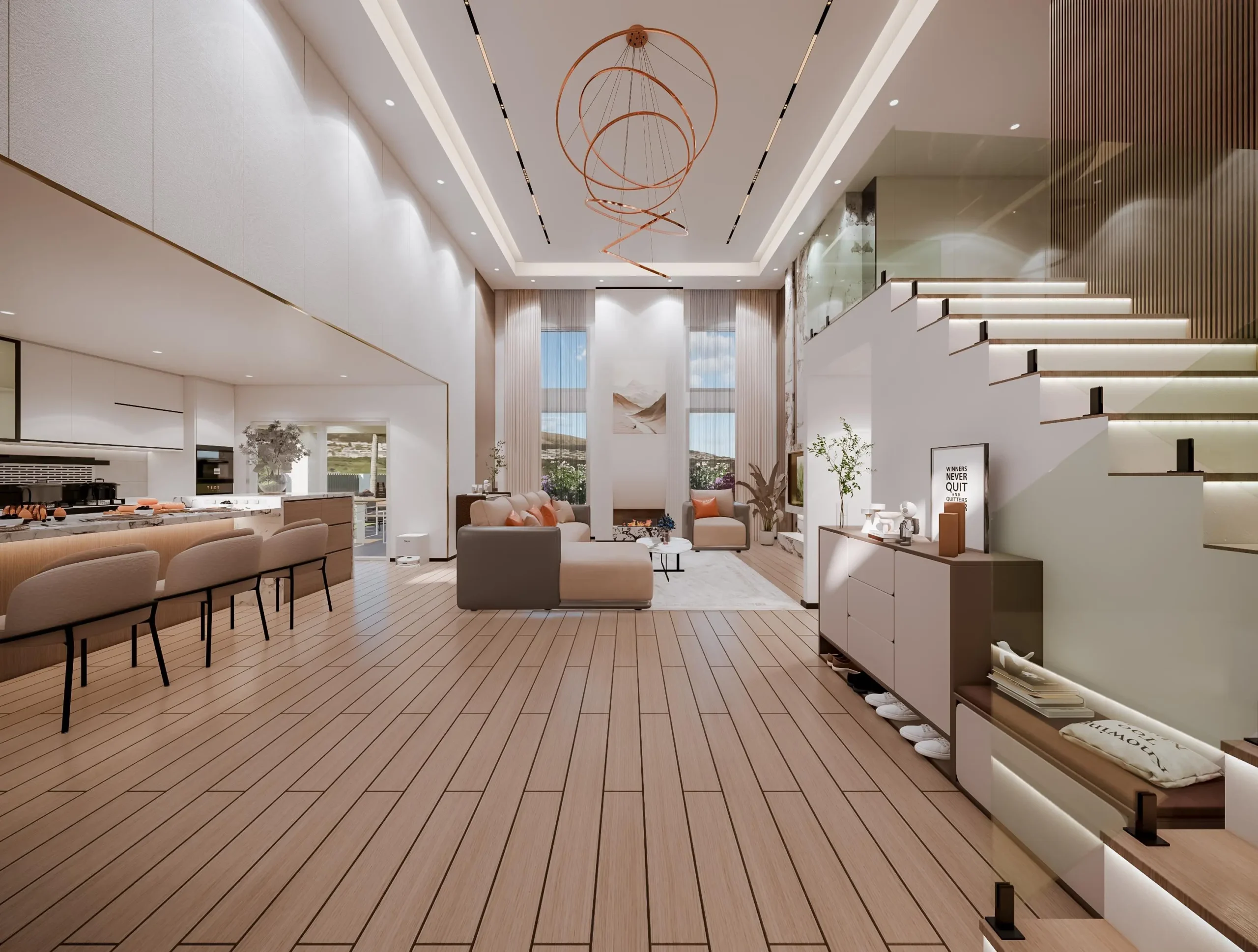 • The Custom Ceiling: The ceiling design is a masterpiece of precision, featuring integrated linear lighting and refined rose gold/brass trim accents that subtly define the space and introduce a light luxury touch. The focal point is the custom-designed sculptural copper chandelier, which adds an artistic, contemporary flair.