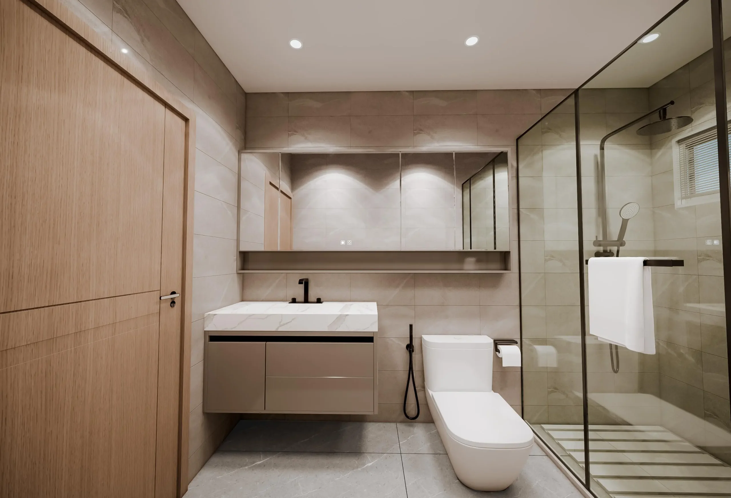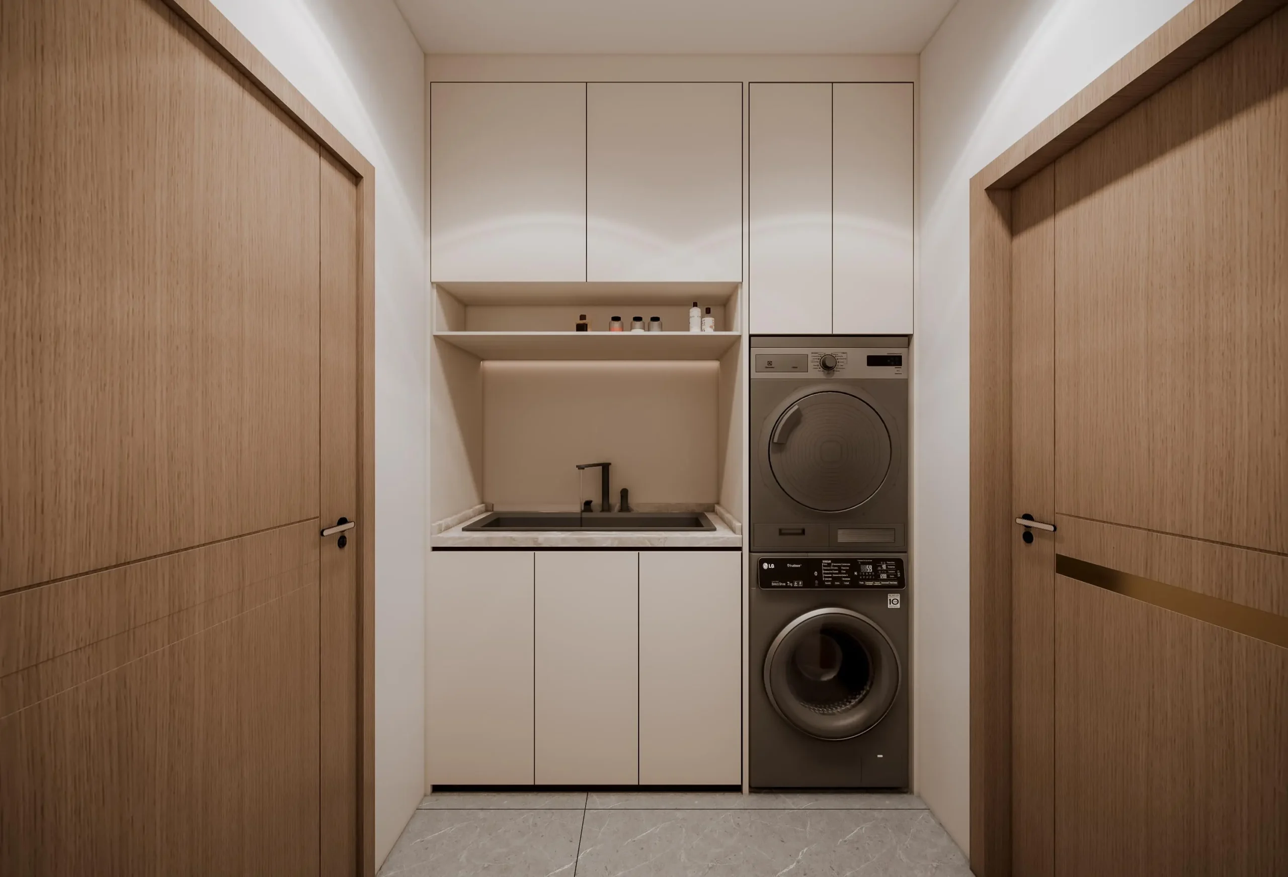 • Seamless Details: The staircase features clean lines and a glass railing, complemented by a bespoke storage cabinet that acts as a subtle room divider while offering practical storage solutions.
