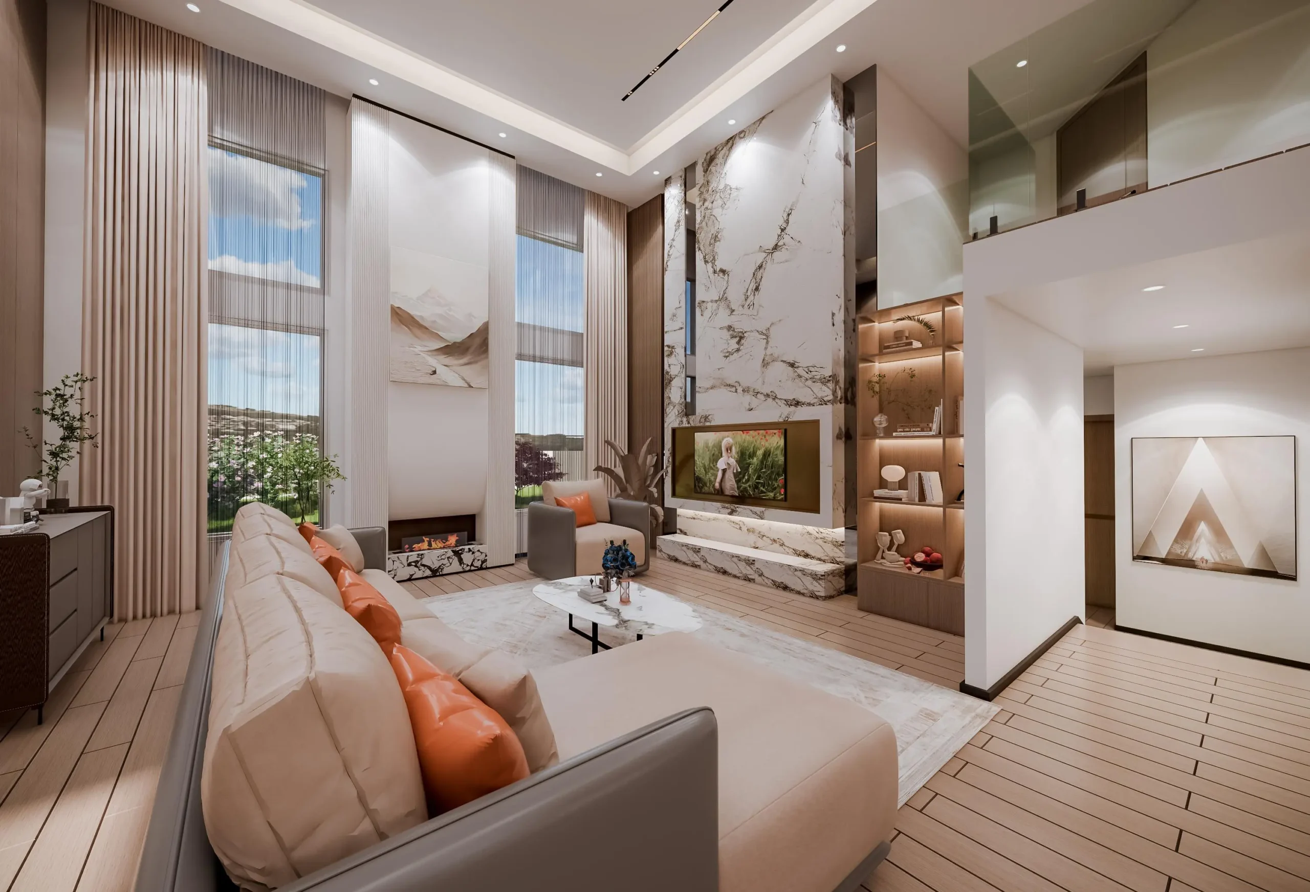 • Architecture & Scale: The double-height living room serves as the majestic centerpiece. Our design strategically utilized the vertical space, employing tall, clean wall panels and full-height drapery to emphasize the volume and scale.
