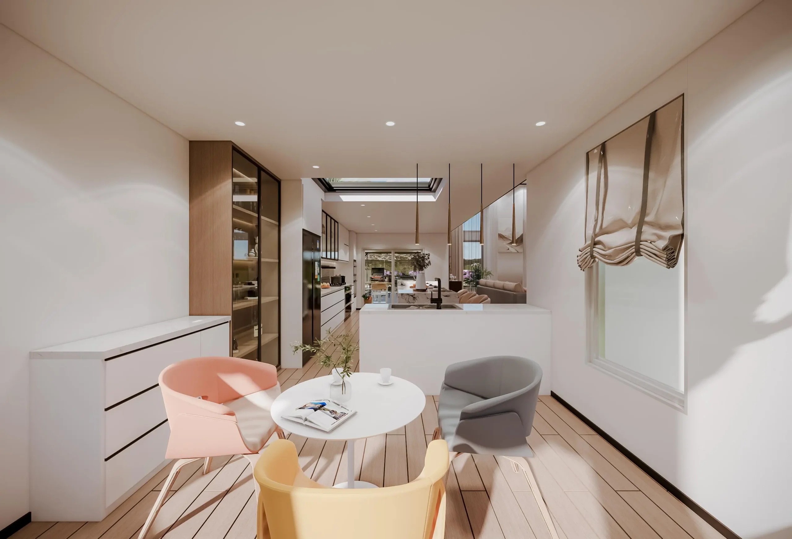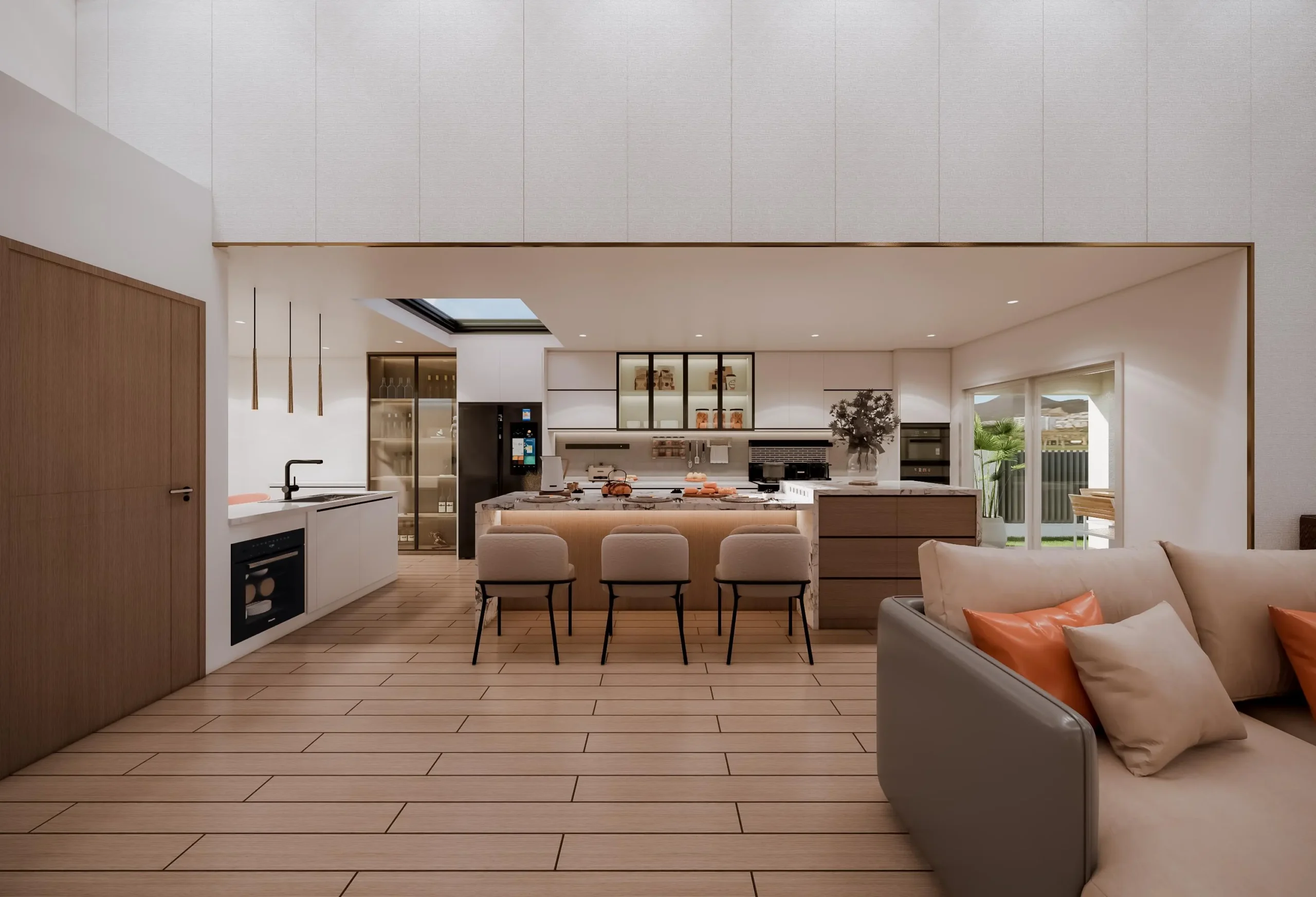 • Integrated Spaces: The flooring uses expansive, warm light wood planking that flows seamlessly from the open-concept living room into the kitchen/dining bar area, connecting the different functional zones.